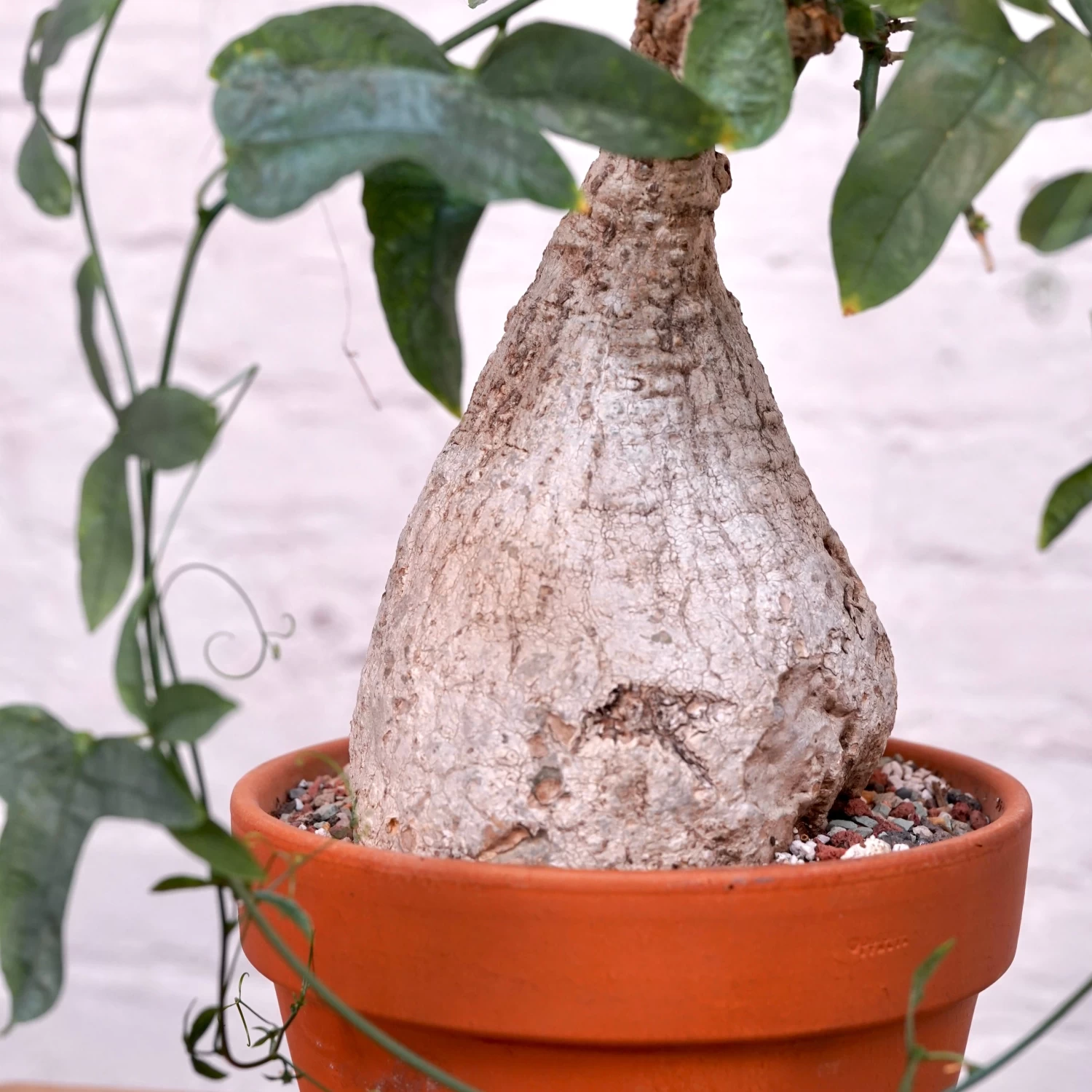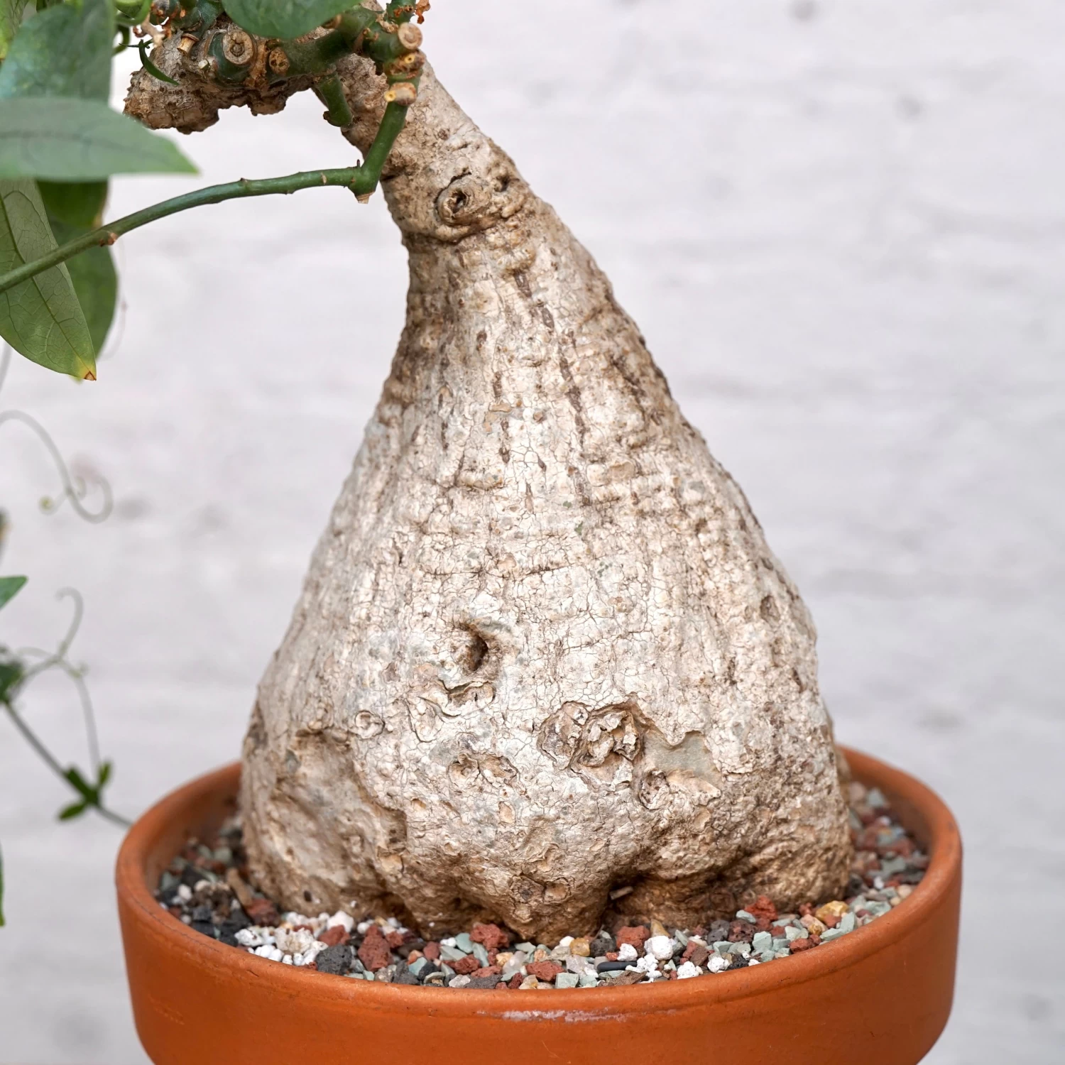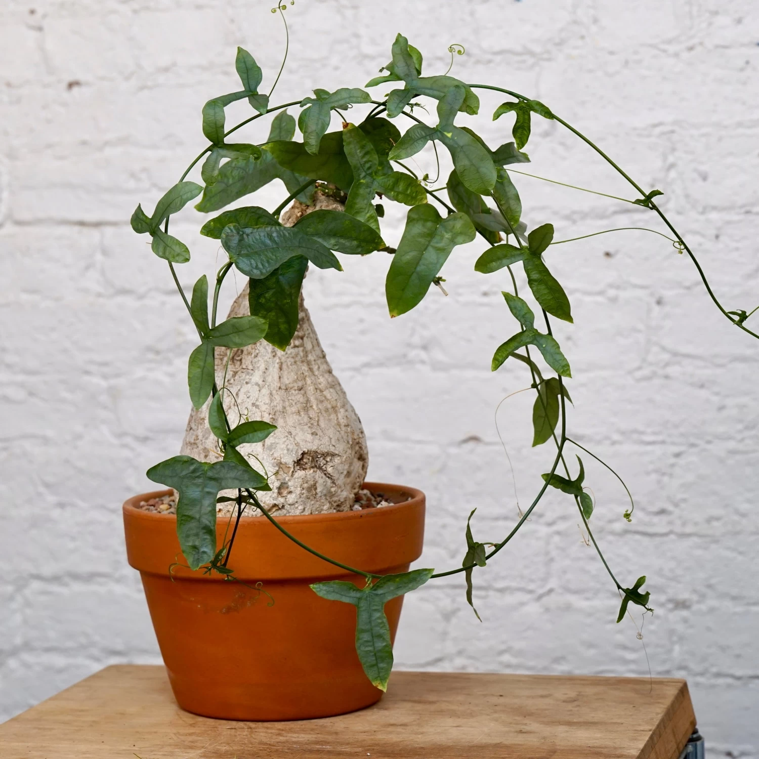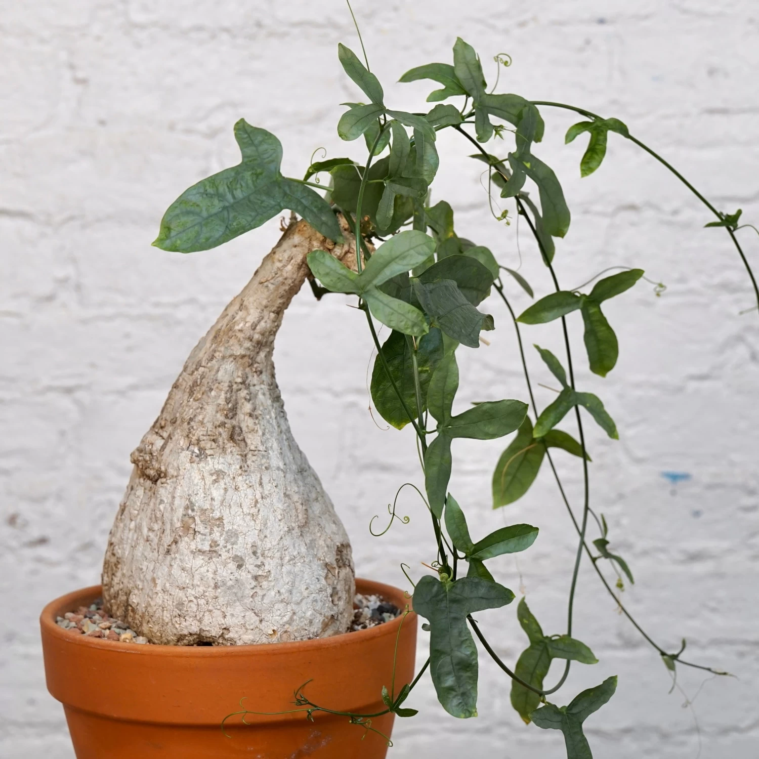 The Adenia form a large, conical caudex and lush vines. Bright indirect or partial direct sun. Water every 2 weeks during growing season but keep dry during it’s winter dormancy when vines will die back.