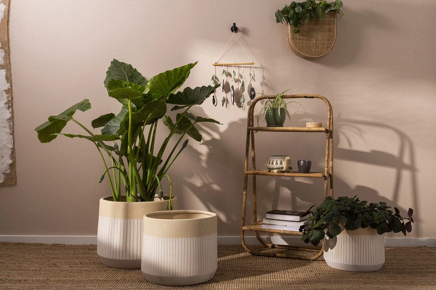An understated artfulness with hand-cut stripes allow the ceramic Aveline Pot to subtly shine while showing off your favorite plants or designs. The oversized Aveline Pot offers a tan and white pattern and matte finish for a modern look.