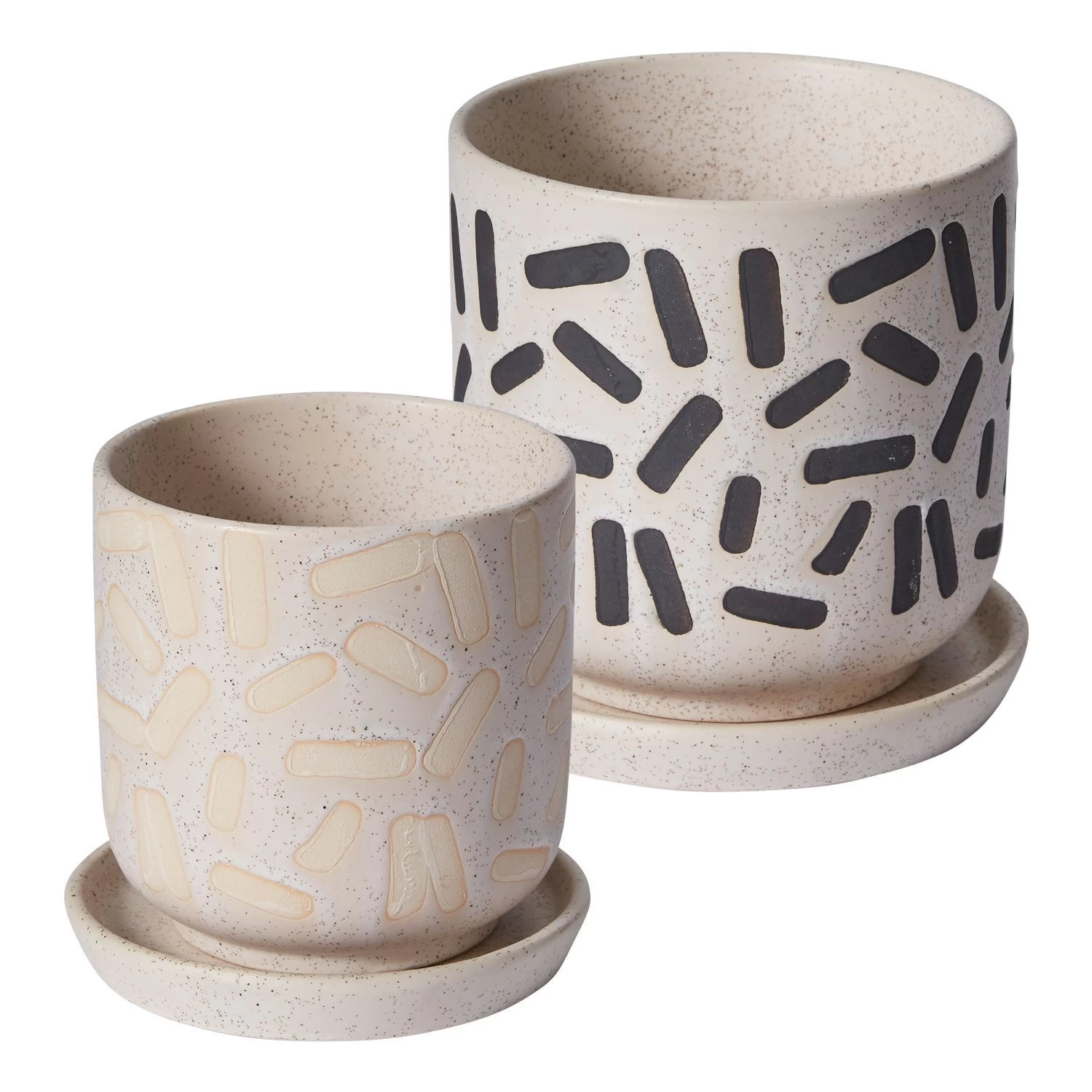 Jelly Bean pattern pot with saucer by Accent Decor. The Sundae Pot features a sesame glaze with stamped shapes scattered across the surface. Plant happiness is a sure bet because of this pot’s drainage hole and saucer.