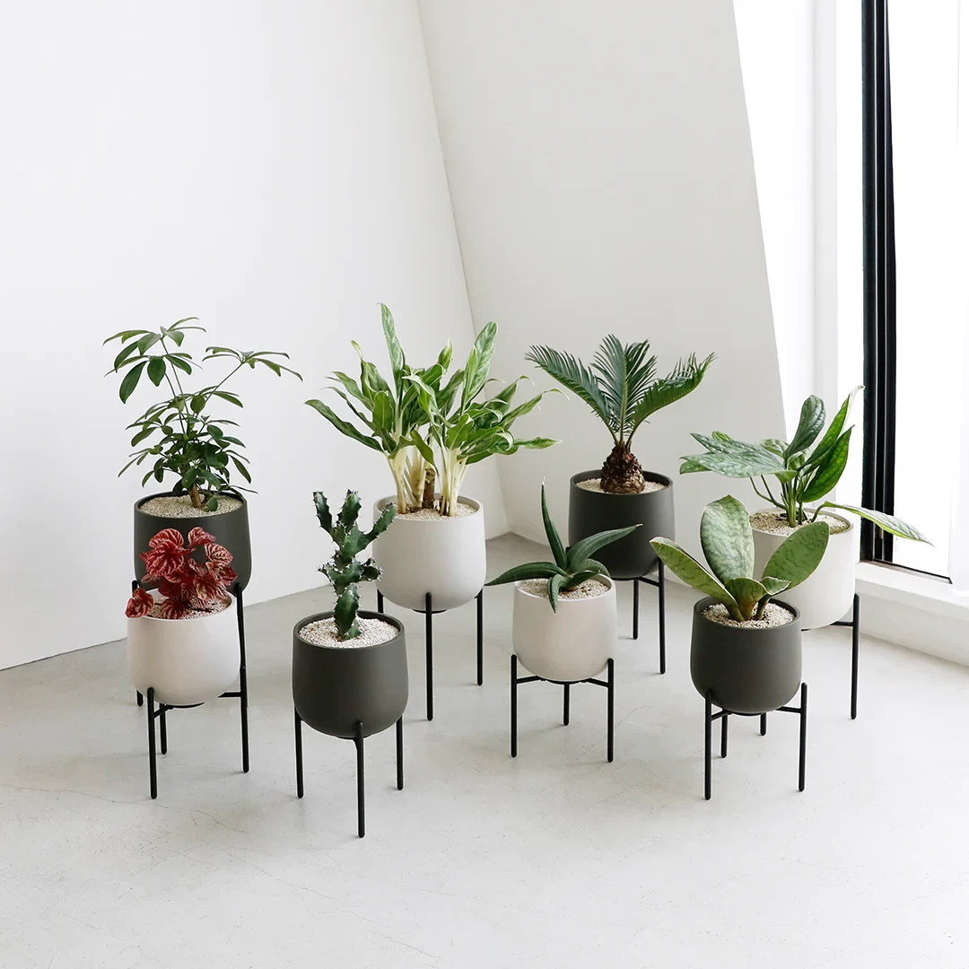 PLANT POT 211 by KINTO comes with a raised stand that gives plants extra height and attention. The sleek stand and textured rounded pot fits effortlessly into a modern interior. Combine different heights for a dynamic effect. The pot has a hole at the bottom so that with a saucer, plants can be watered without moving the pot – after watering the included silicon cap prevents any stray drips landing on your surfaces.Smaller Size:[Set] φ5.4 x H9.2 x W6.2 in | Approx. 2 lb[Pot] φ5.4 x H4.8 x W5.8 in | Approx. 1.5 lb[Stand] W5.4 x D4.6 x H5.7 in | Approx. 0.5 lbLarger Size:[Set] φ6.4 x H11.4 x W7.2 in | Approx. 3 lb[[Pot] φ6.4 x H5.6 x W6.8 in | Approx. 2.3 lb[Stand] W6.3 x D5.4 x H7.4 in | Approx. 0.7 lb[Pot] Ceramic | [Stand] Zinc alloy (powder coating), Withstand load: 4kg | [Cap] Silicone | Made in China
