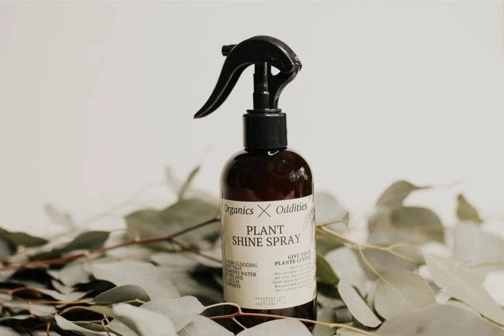 This Plant Shine Spray by Organics X Oddities is a non-clogging mist that removes water spots and calcium deposits It wonβt clog leaf pores and has a gentle lemongrass scent.
