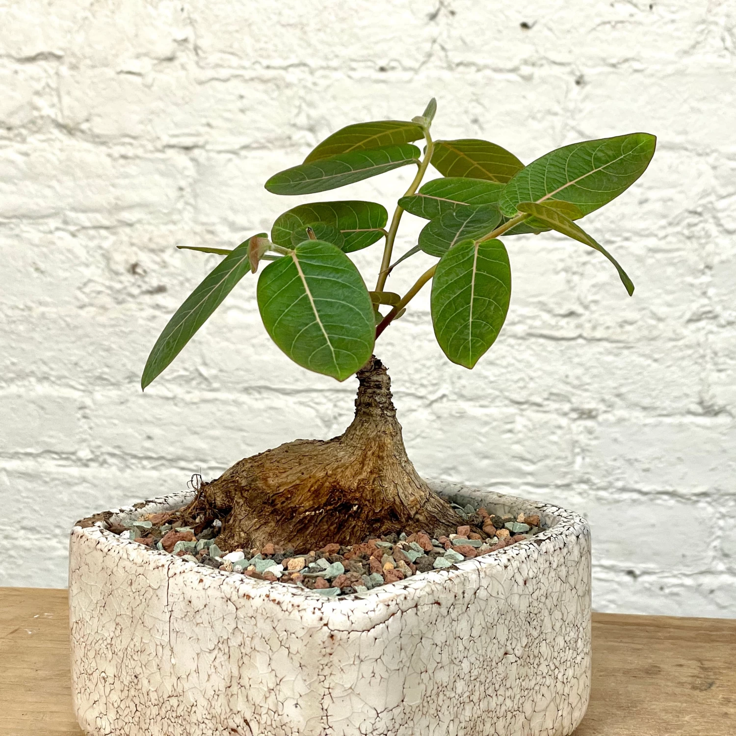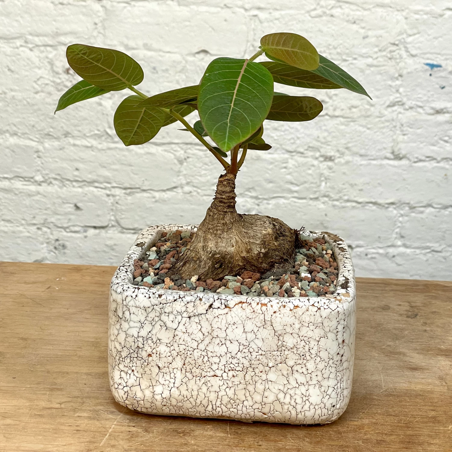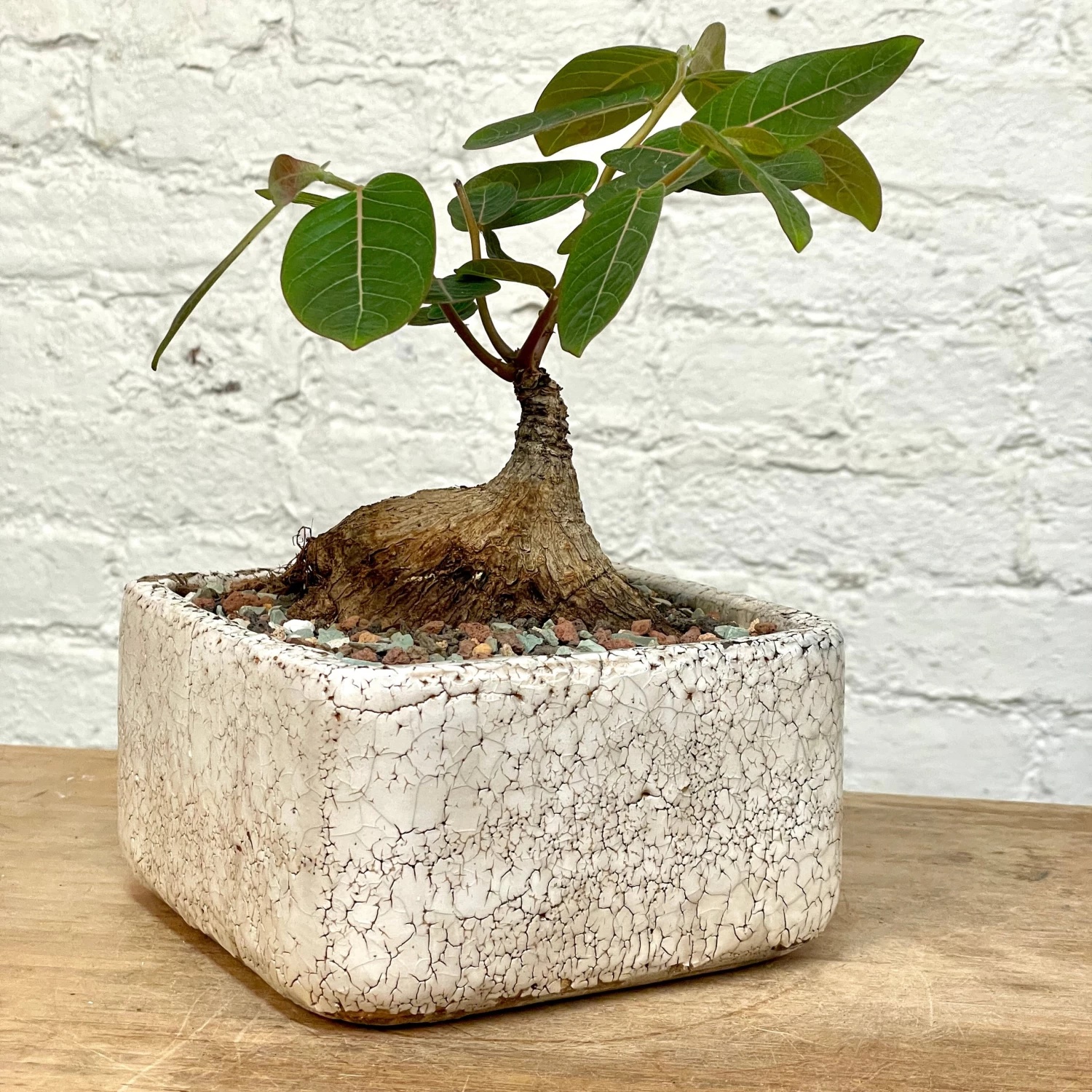 This specimen features a 4 inch wide caudex. The plant is growing in a distressed, crackle-glaze square ceramic planter.