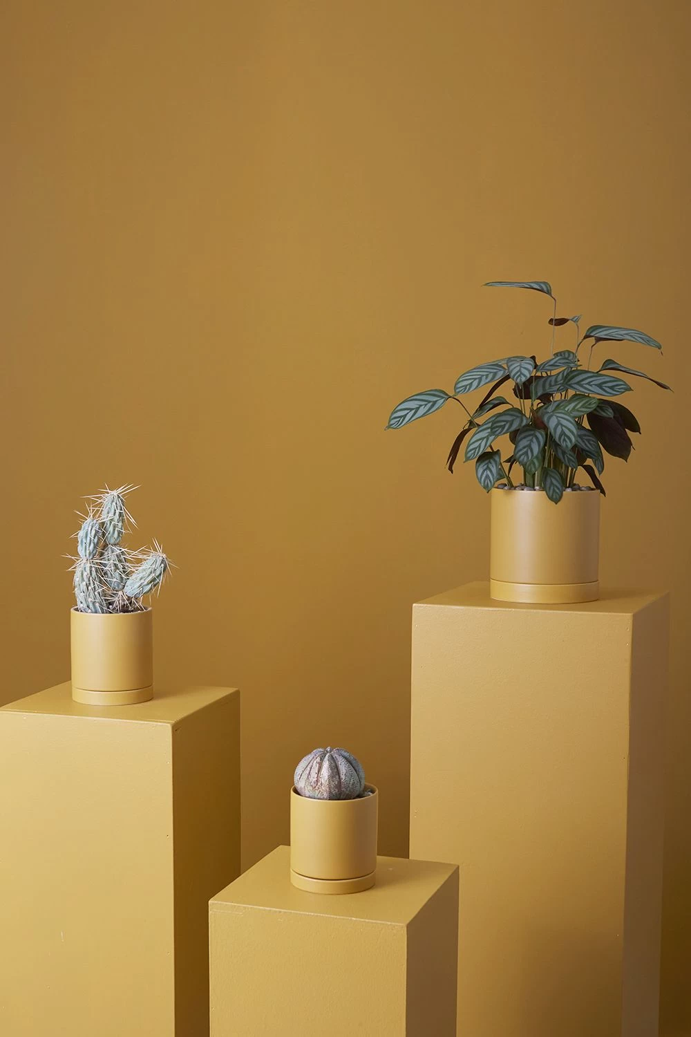 Classic, versatile ROMEY pots by Accent Decor. Simple ceramic cylinder planter with drain hole and separate saucer.Comes in Burnt Orange (Terracotta) White, Black, Sage and Ochre/Mustard Yellow.