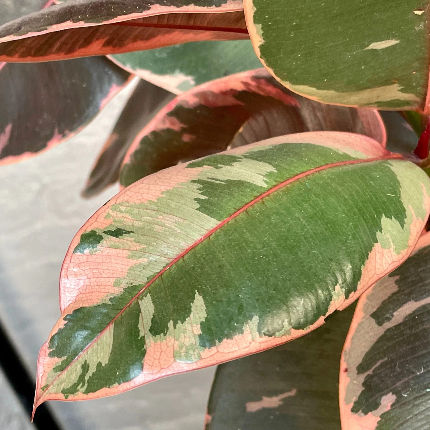 The Ficus Decora “Ruby” is a popular Rubber Plant cultivar with spectacular variegation – cream, green and vivid pink. Their thick glossy leaves look great in these colors and the plant itself is very easy to care for.Rubber plants will tolerate lower light conditions but colorful varieties like the Ruby will look best when they receive a splash of direct light. Water every 10-14 days, allowing soil to dry out between waterings. Don’t worry if you forget a watering, these plants are very forgiving. Tolerates any humidity level.8 and 10 Inch Nursery Pots