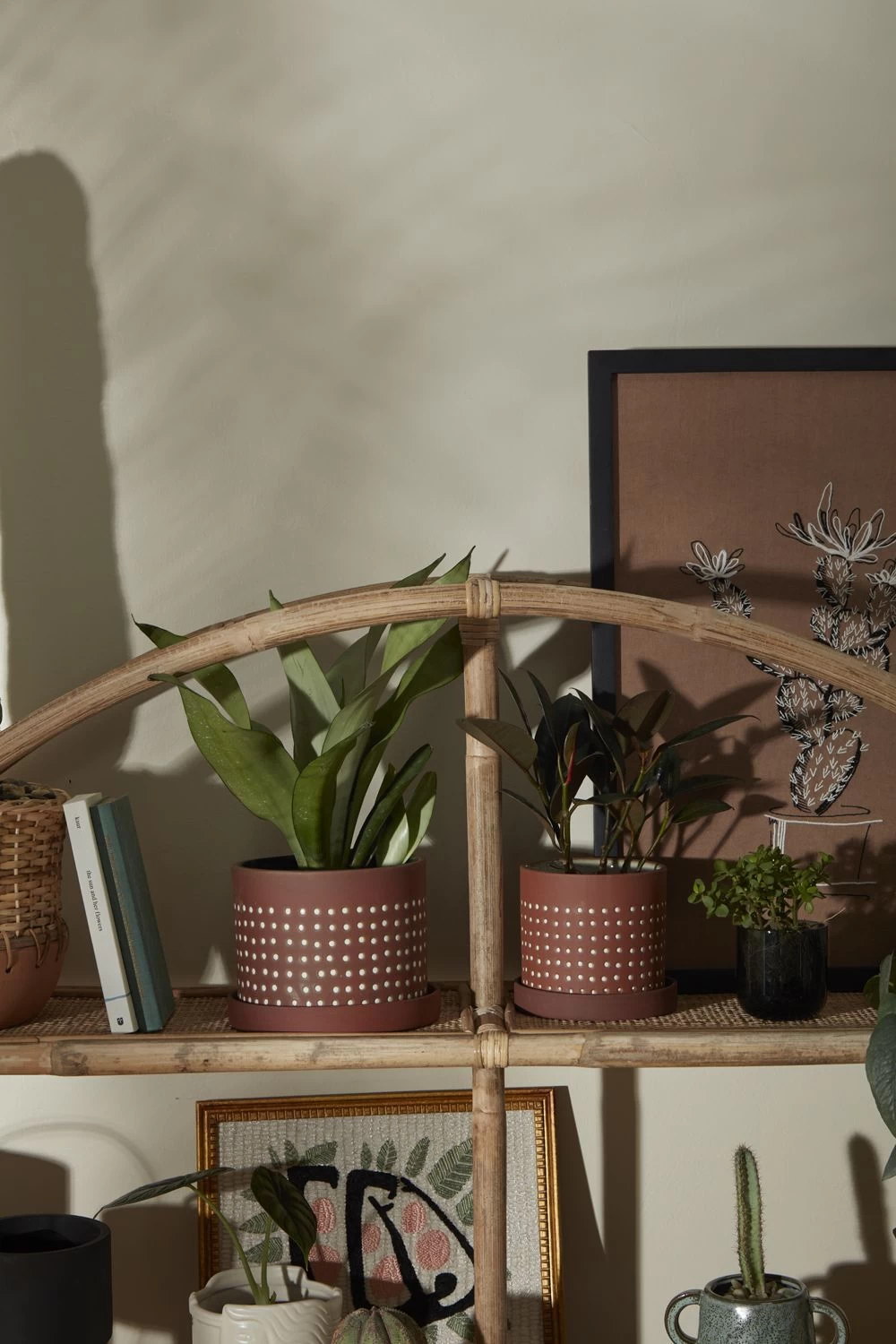 Warm up your surfaces with the earthy, understated hues of the Salamanca Pot. Ceramic with a natural terracotta exterior, a smooth white glazed interior & subtle textured white dot motifing, this classic shaped pot & saucer blends into any decor.