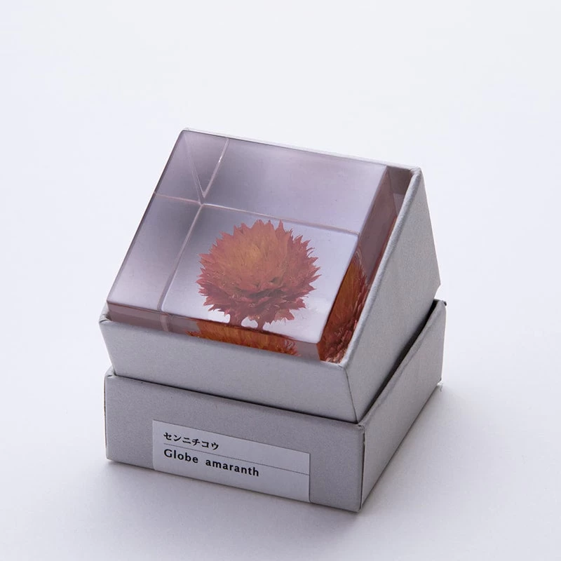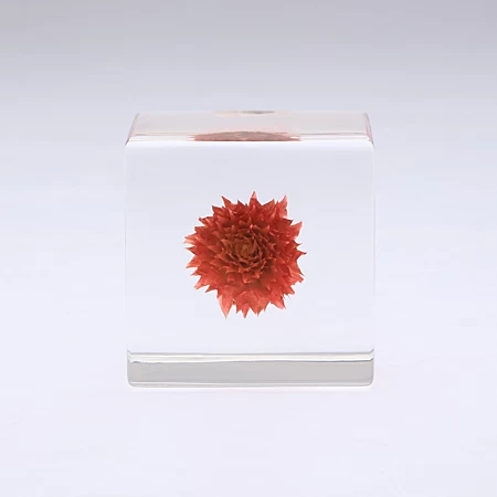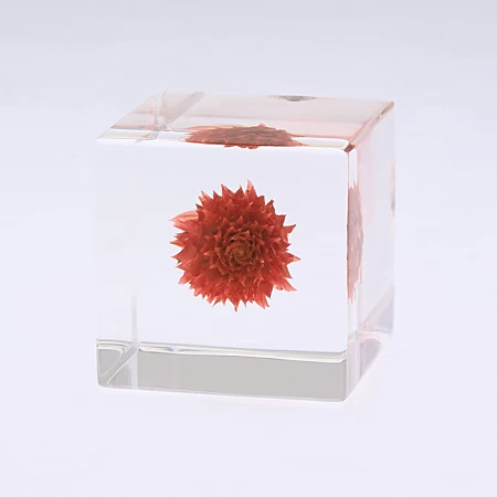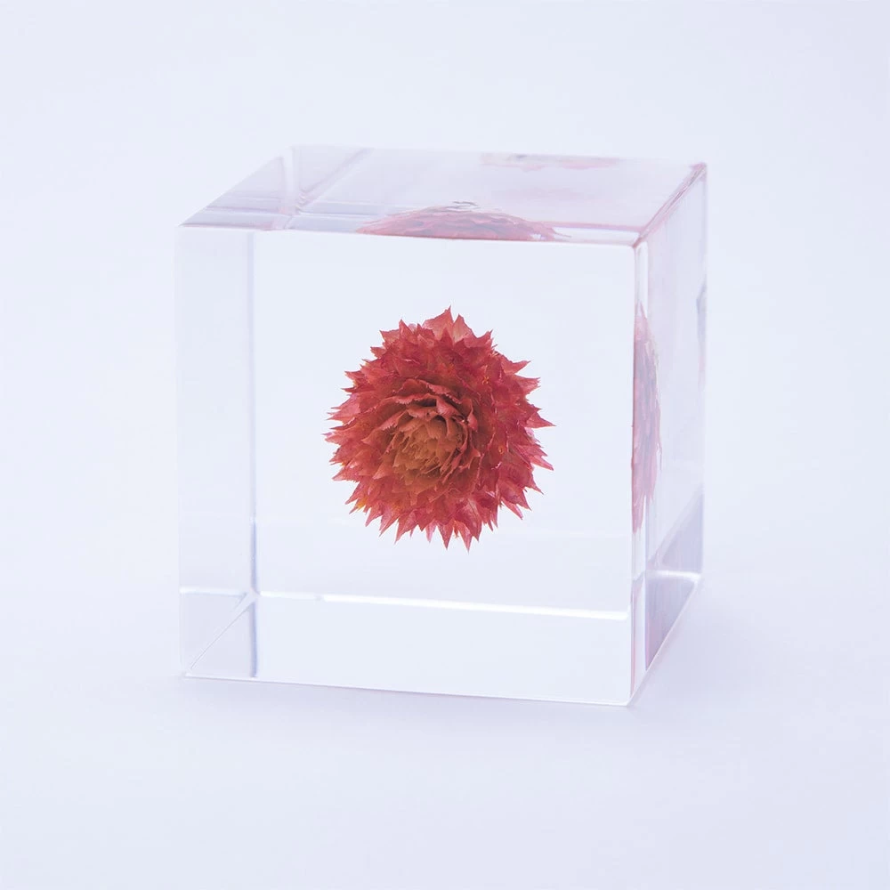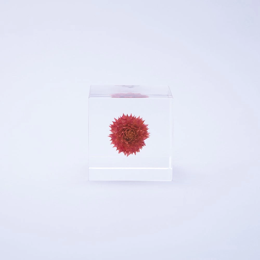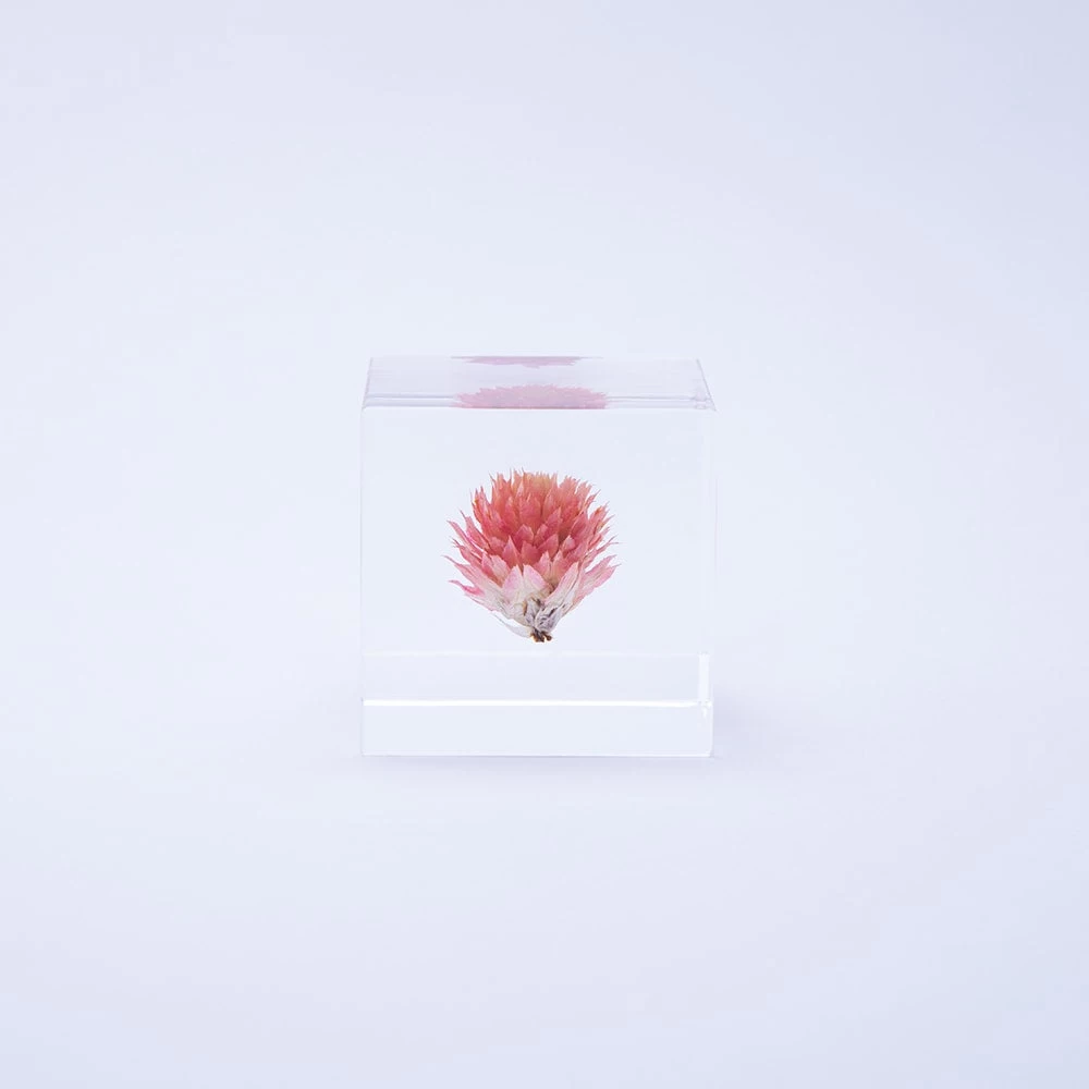 1.6 acrylic cube with Globe Amaranth; made in Japan.