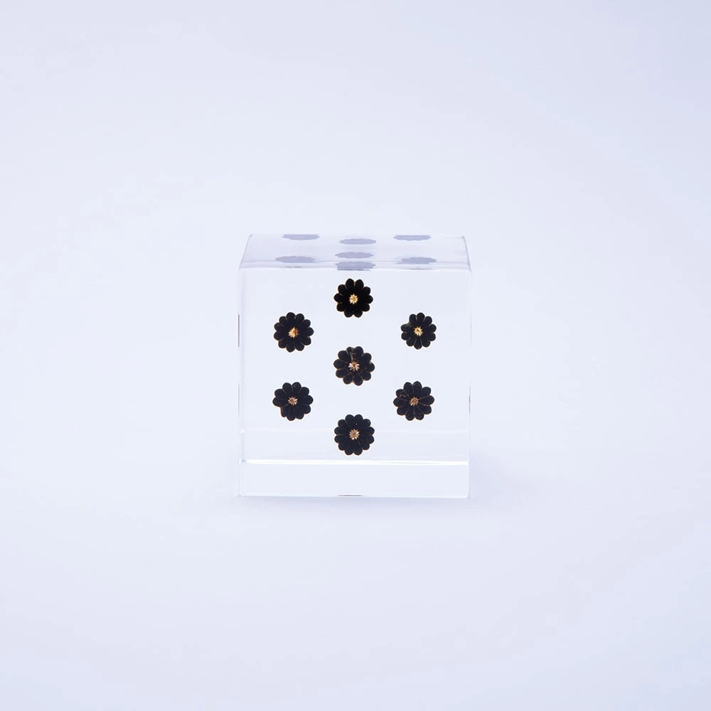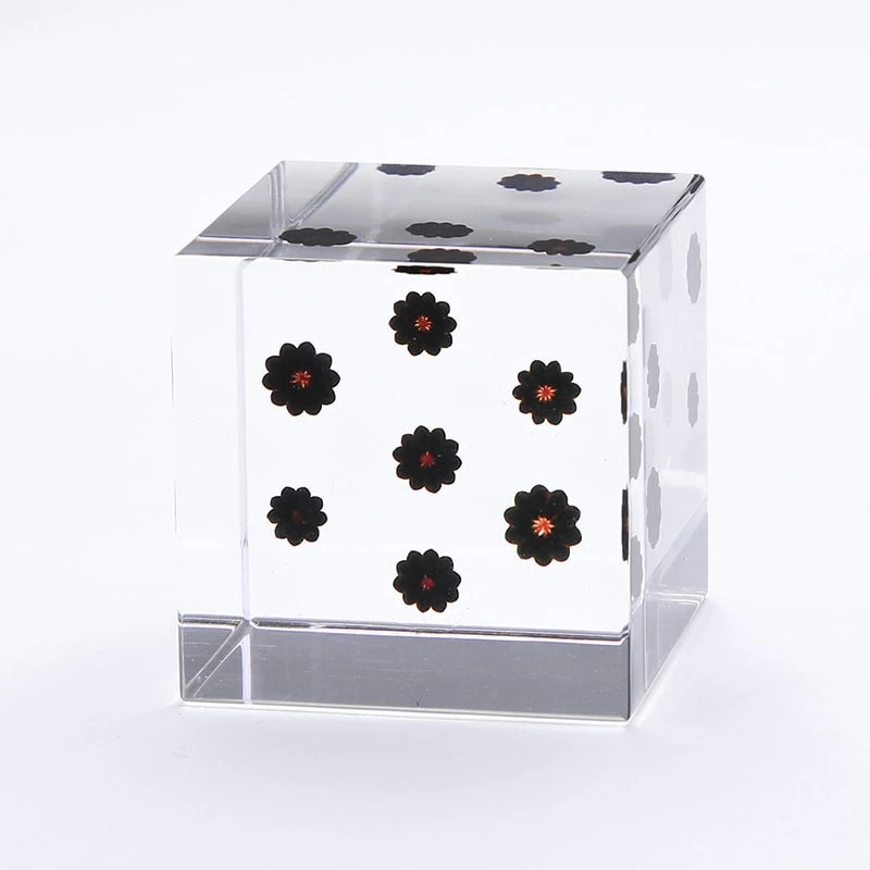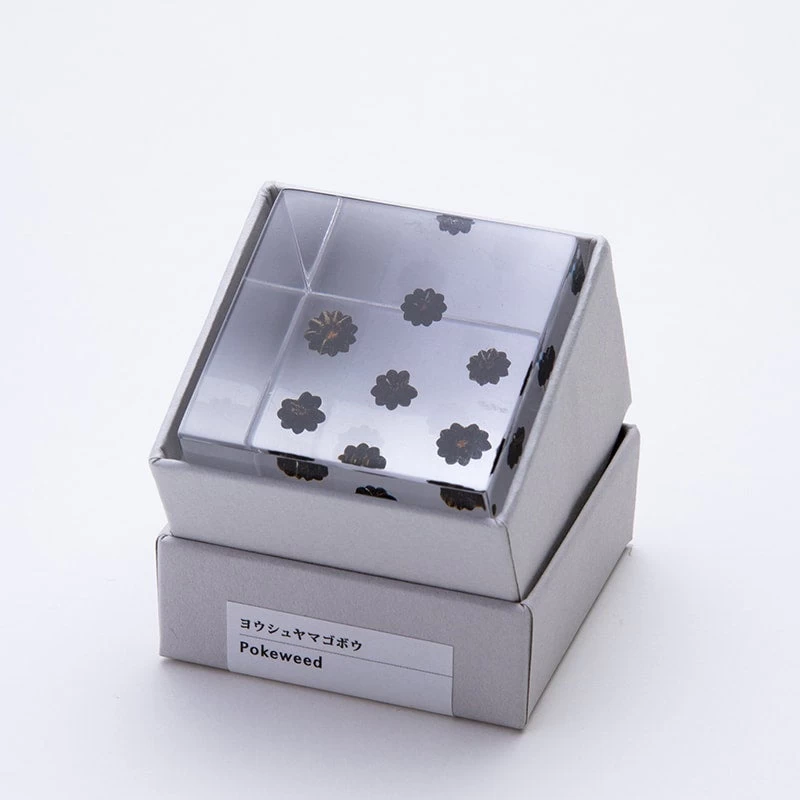 1.6 inch acrylic resin cube with pokeweed; made in Japan.