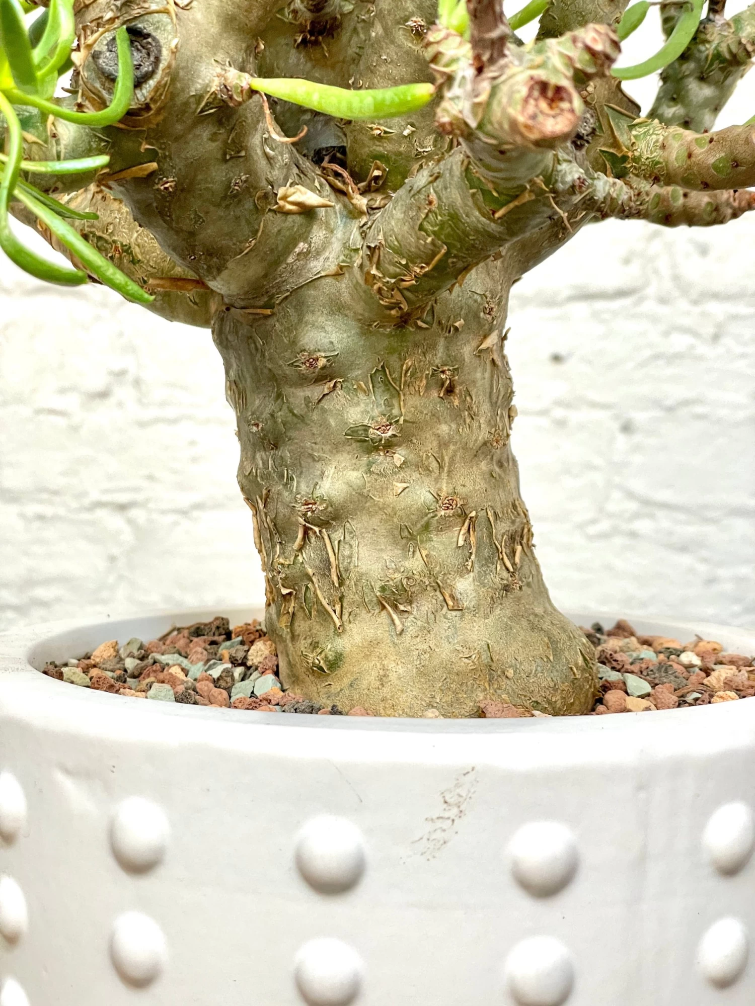 This specimen is growing in a one gallon nursery pot. It has already shows a very fat trunk, it is approximately 11 inches in height.