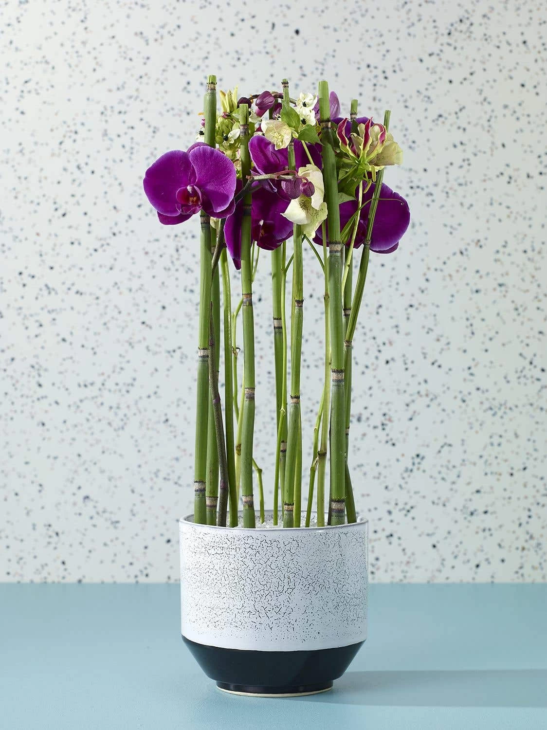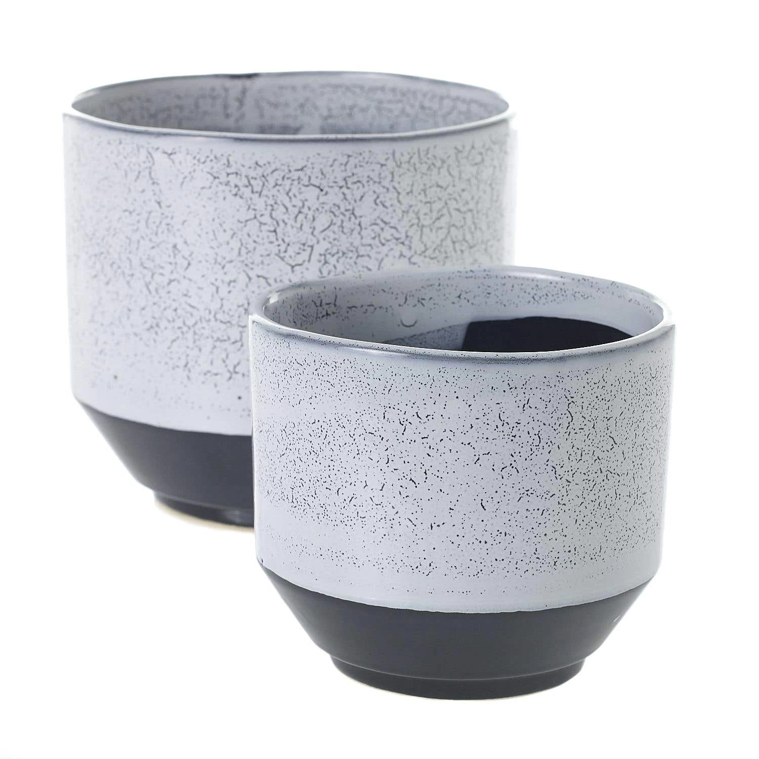 Vanna Pots by Accent Decor combine a grey crackle glaze on the upper part of the pot with a glossy black on the lower portion.