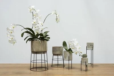 Mottled grey / tan glazed ceramic cylinder paired with metal tripod stand. Perfect drop-in cache pot for 4 and 6 inch nursery pots.